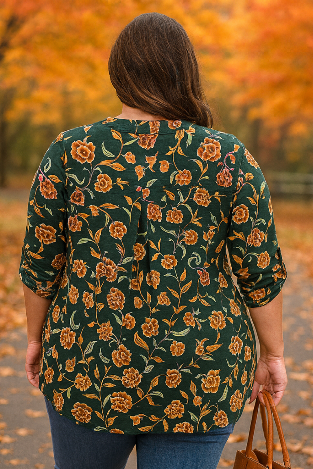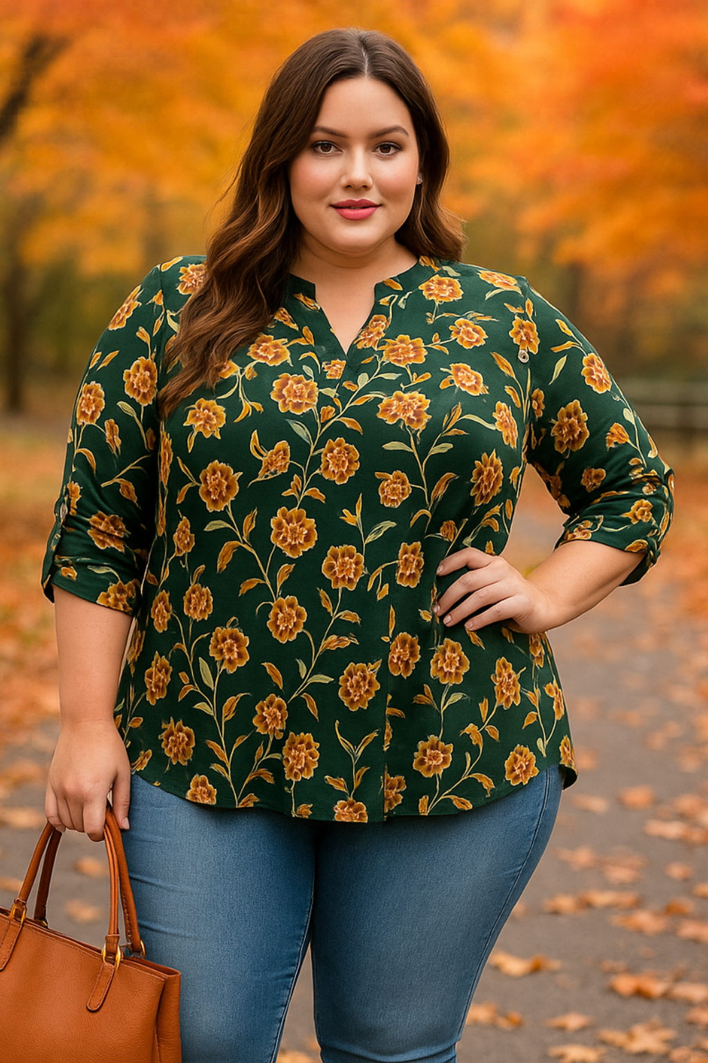 Apportez une touche de charme à vos looks avec cette tunique verte à imprimé floral chaleureux.