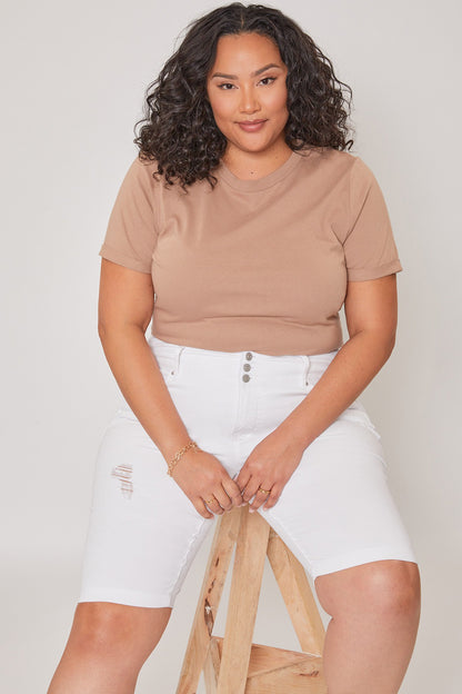 Notre bermuda en denim à 3 boutons Missy Plus, polyvalent à l’infini. Doté d’une large ceinture large, d’une braguette zippée sur le devant avec fermeture à trois boutons et de passants de ceinture.