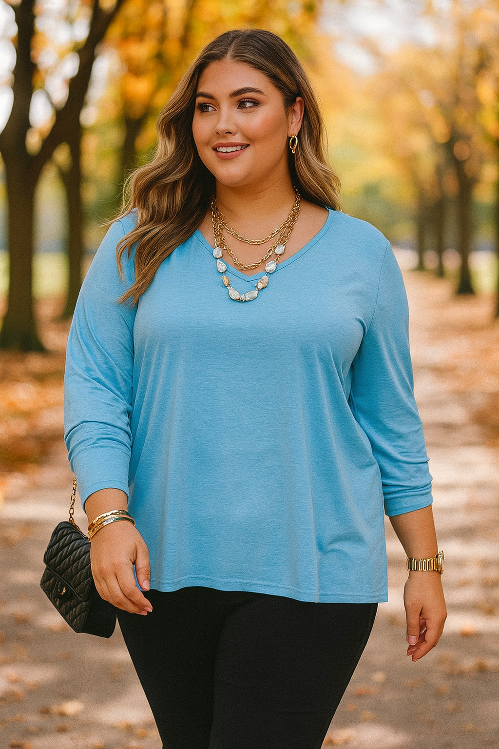 Haut classique en poly bled infroissable avec un col en V et des manches 3/4".
