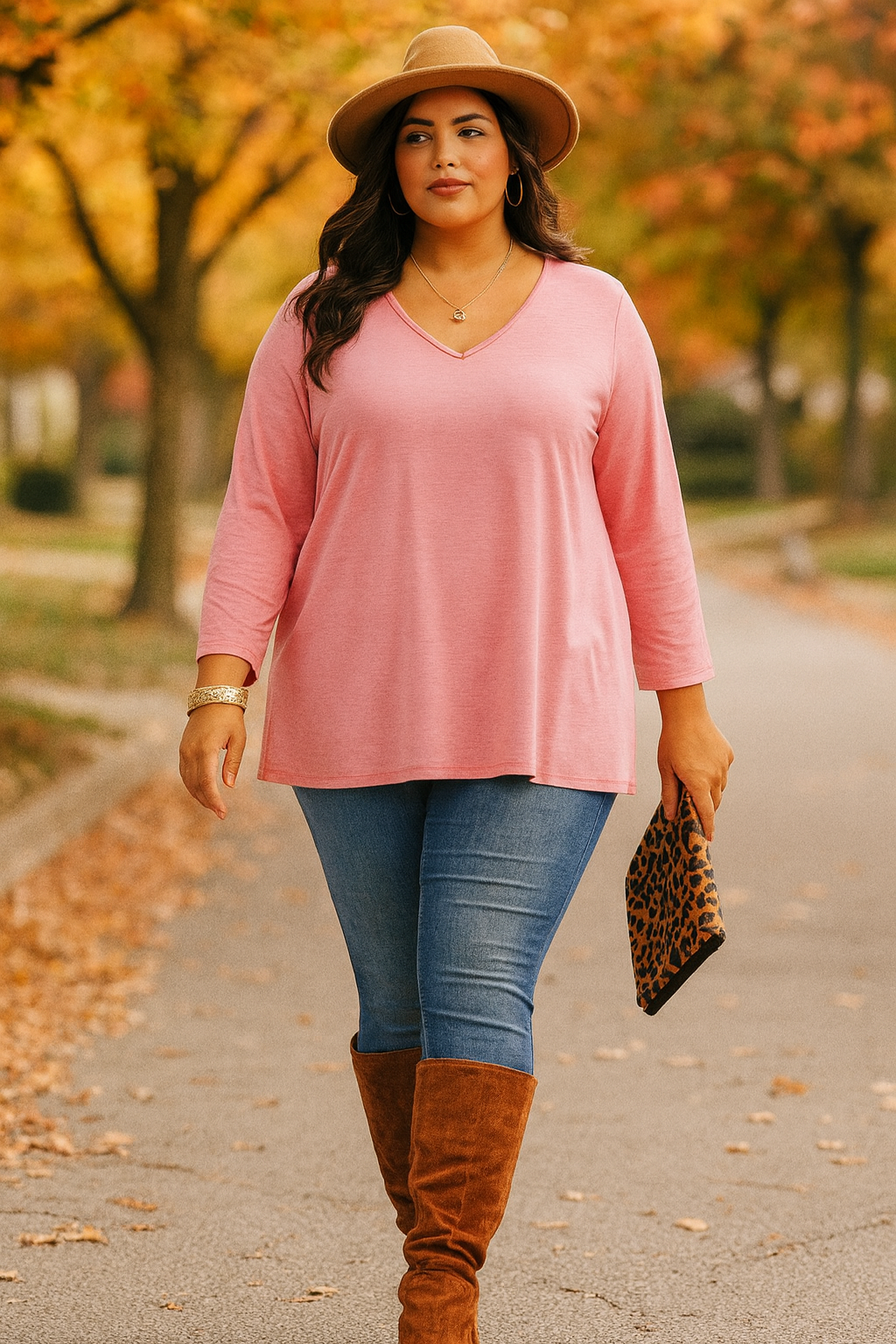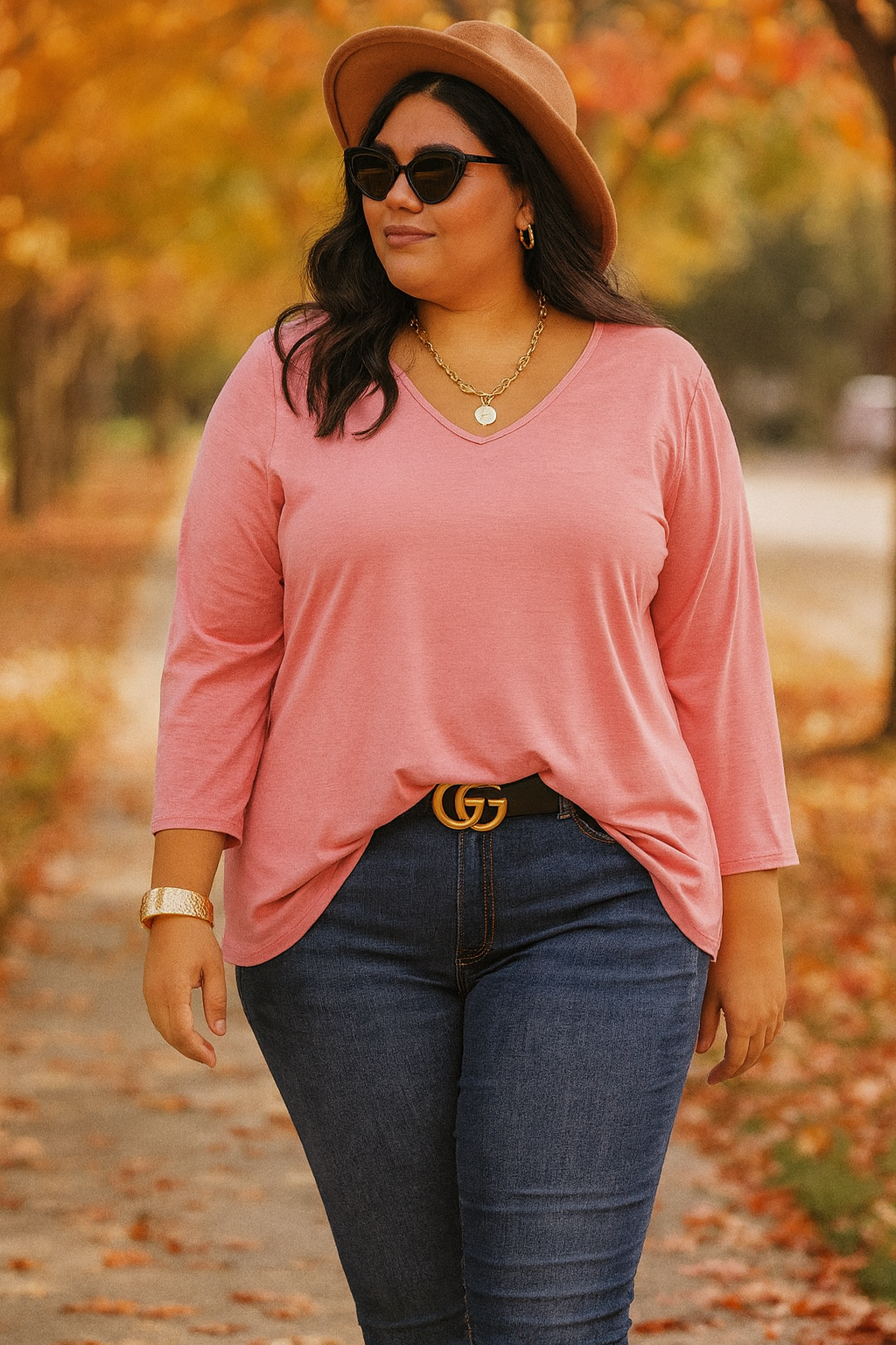 Haut classique en poly bled infroissable avec un col en V et des manches 3/4".