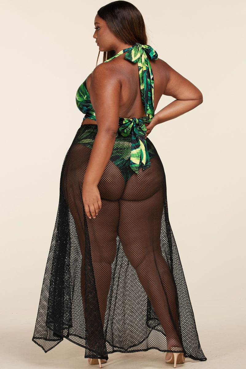 Ce look prêt pour le tout inclus comprend un haut à licou qui s'attache dans le dos et une jupe longue. Des joints toriques écaille de tortue relient le haut à la jupe longue en maille qui montre le body assorti en dessous.