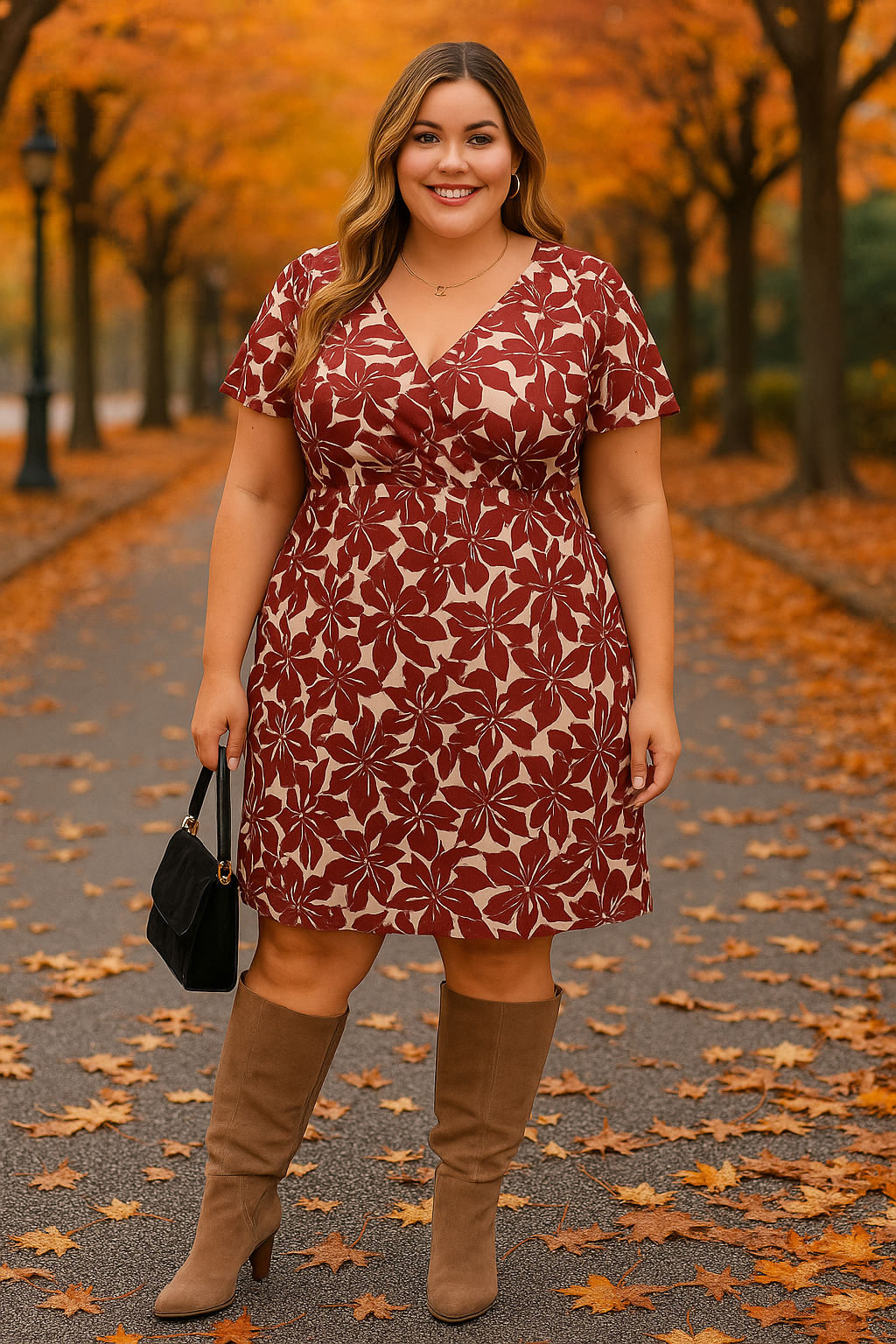 Cette robe à imprimé floral rouille et beige est la pièce parfaite pour allier confort et féminité. Confectionnée dans un tissu extensible et fluide (95% polyester, 5% spandex), elle épouse les formes tout en offrant une grande liberté de mouvement.