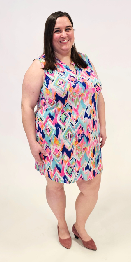 La robe débardeur Lizzy est enfin là! Cette robe est dotée d’un corsage trapèze avec col mao et détails plissés dans le dos.